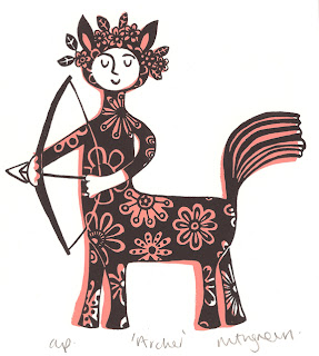 Today I'm continuing to print the 'Firedbird' design. I've been experimenting with gold ink, trying to vary the tones with the addition of acrylic colours. And then, I'll be drawing the little centaur. The mythical creatures theme has got my imagination going. I saw some beautiful carved lions at the Pergamon Museum in Berlin last weekend, it would be wonderful to have a winged lion as part of the group. Better pull my finger out!